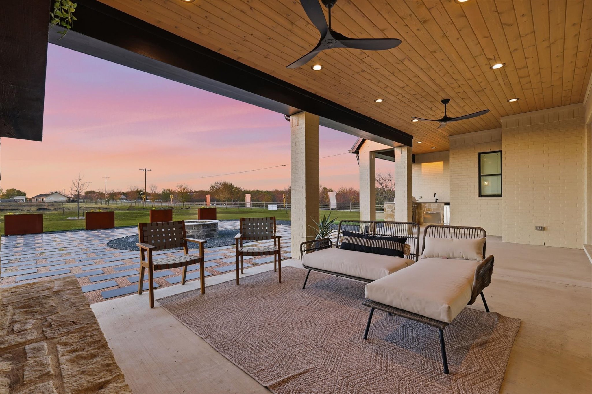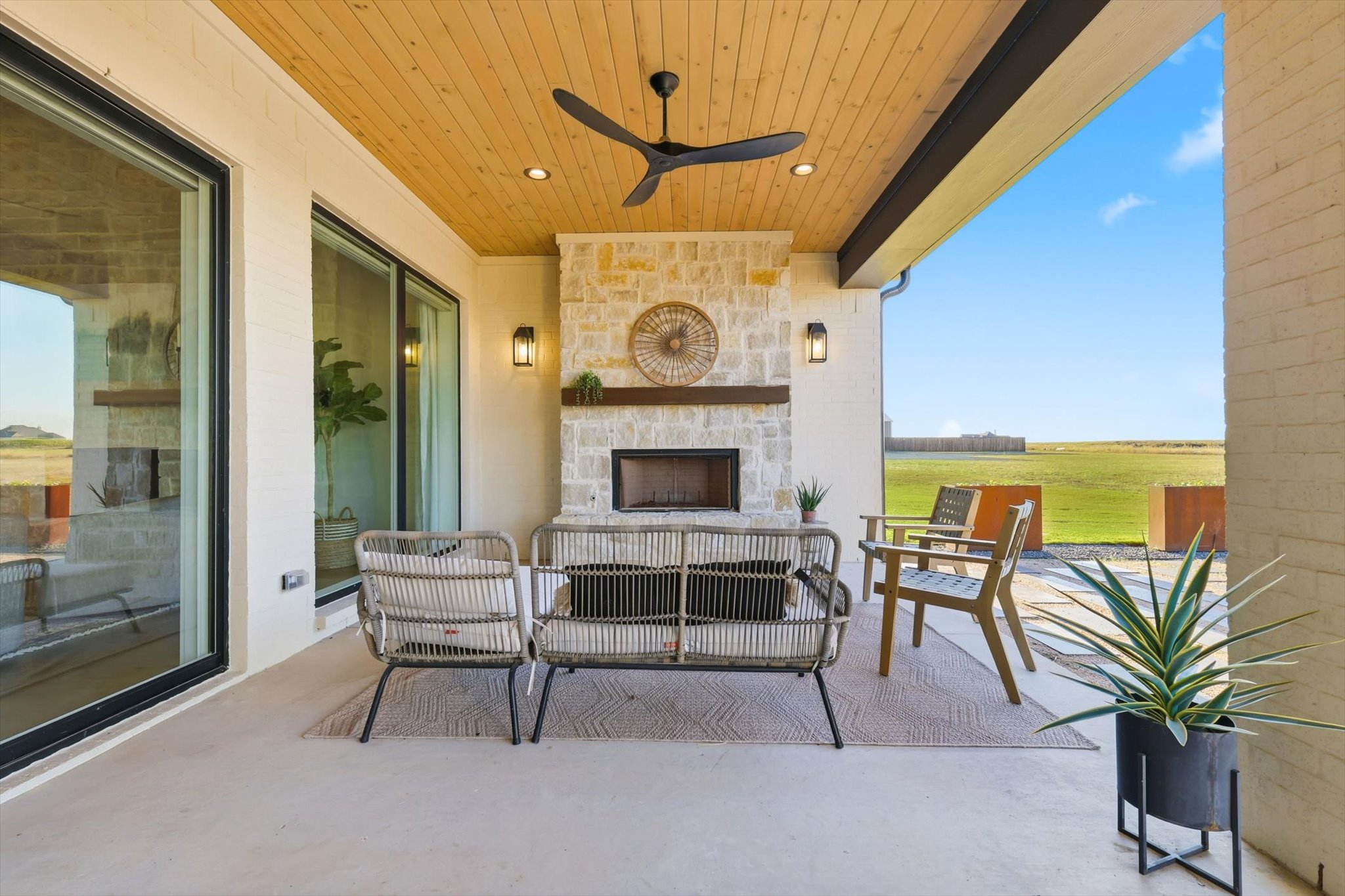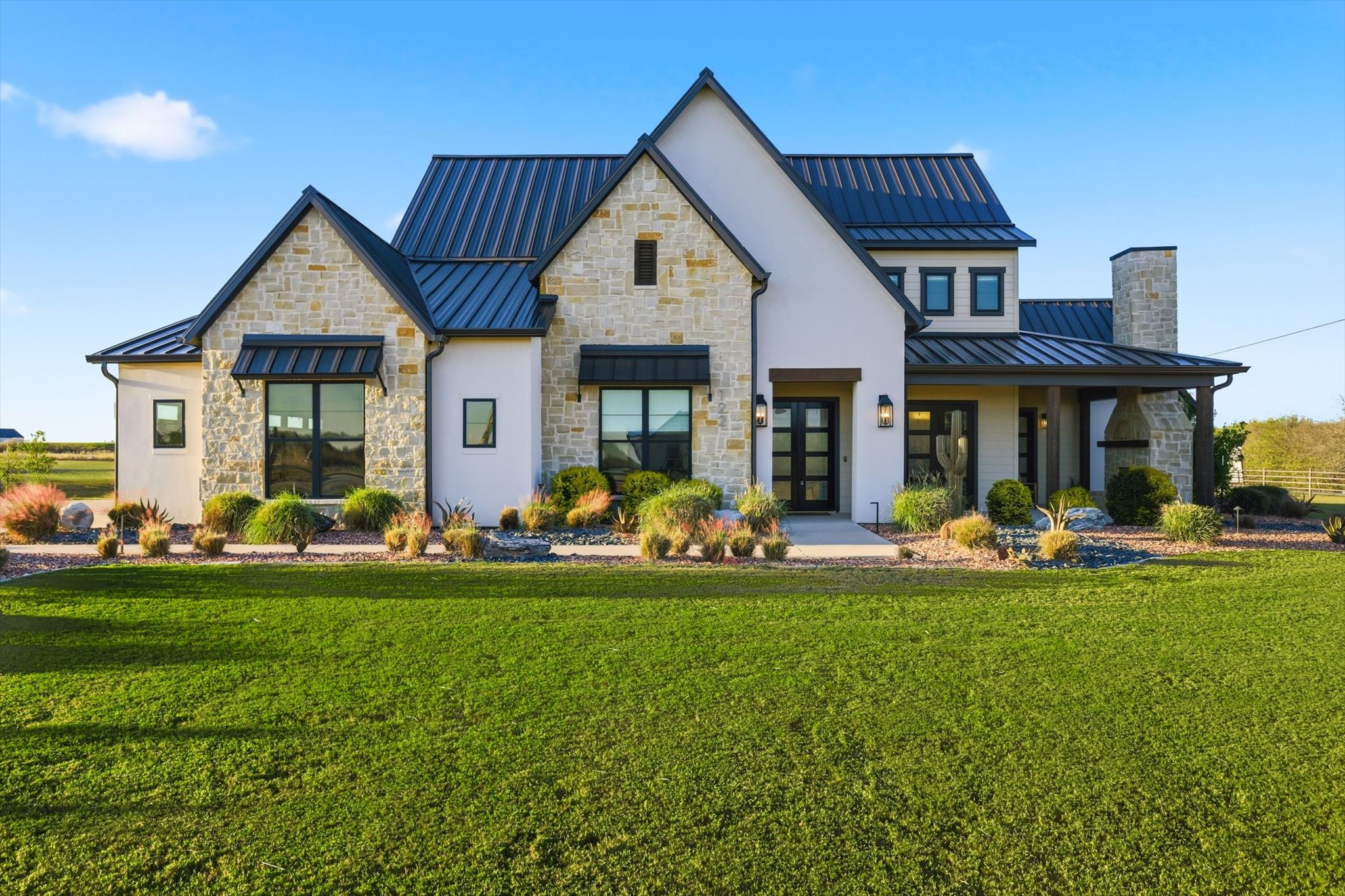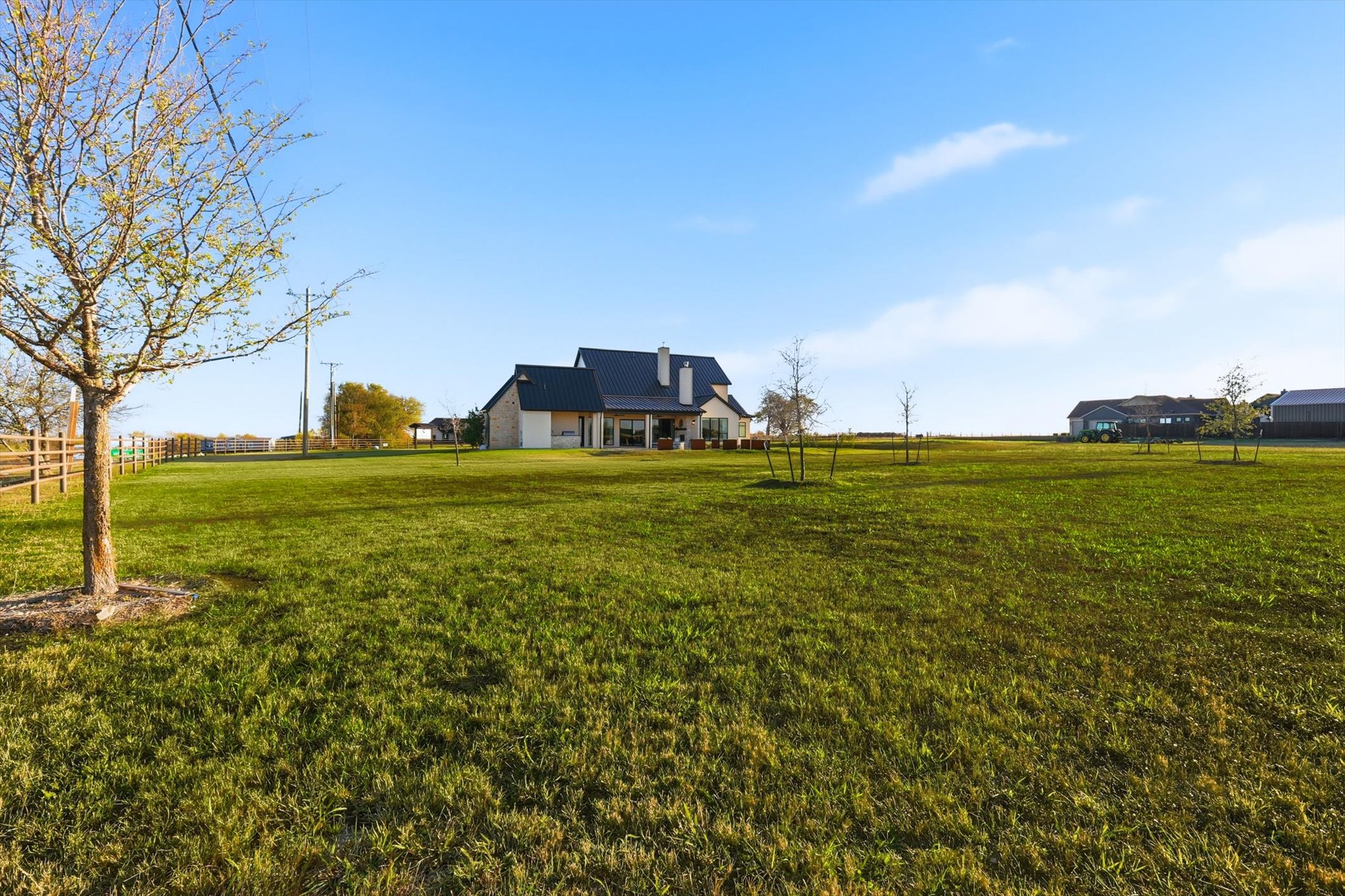 Located Outside City Limits, discover luxury in this 3,507 sq ft former model home on over an acre of beautifully landscaped grounds. This four-bedroom, three-bathroom residence includes a private study and features a seamless open-concept layout, perfect for entertaining. The chef’s kitchen showcases a 48” KitchenAid full gas range, striking stone backsplash, and a beautiful mix of painted white and white oak cabinetry, with a stunning white oak island as the centerpiece. The open flow from kitchen to dining and living areas creates a bright, inviting space ideal for gatherings. Large windows and sliding door give you natural light and gorgeous view of backyard. The private study features custom-made barn doors, and other custom barn doors are also carried throughout the home in the laundry room and the primary bathroom for a cohesive designer look. The primary suite is a true retreat with vaulted ceilings, lots of built in cabinets for storage, a spa-style bath featuring a freestanding soaking tub, oversized dual-head shower, double vanities, and an expansive walk-in closet with a custom island. Built for efficiency and durability, the home includes a full metal roof, spray foam insulation, and a fully encapsulated structure. Enjoy outdoor living in the covered outdoor kitchen featuring Coyote grill, refrigerator, sink, and stone countertops — perfect for year-round entertaining. There are four fireplaces, one in the living room, one on the front and back patio, and a fire pit! Coffee Bar and Walk in Pantry are off to the side of the kitchen, close to a door that leads you to the front patio and fireplace, perfect spot for morning coffee.