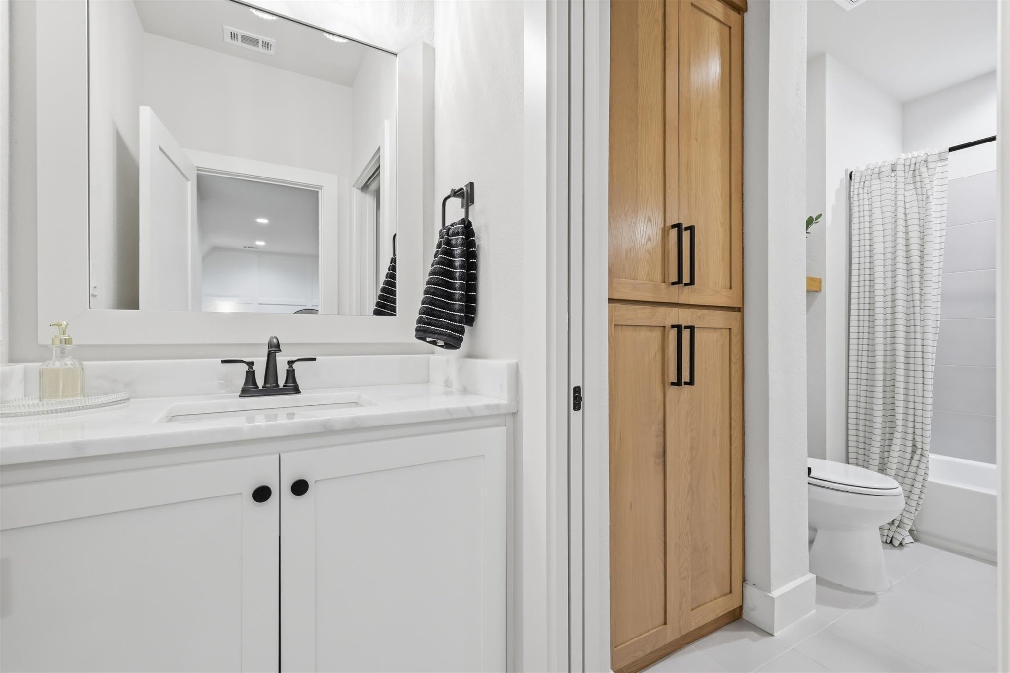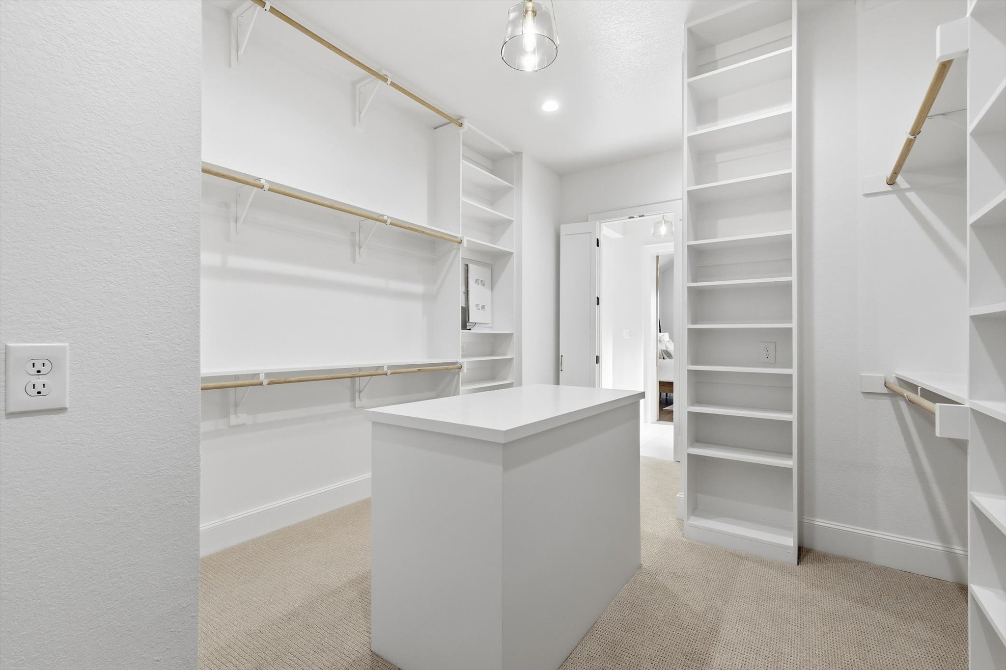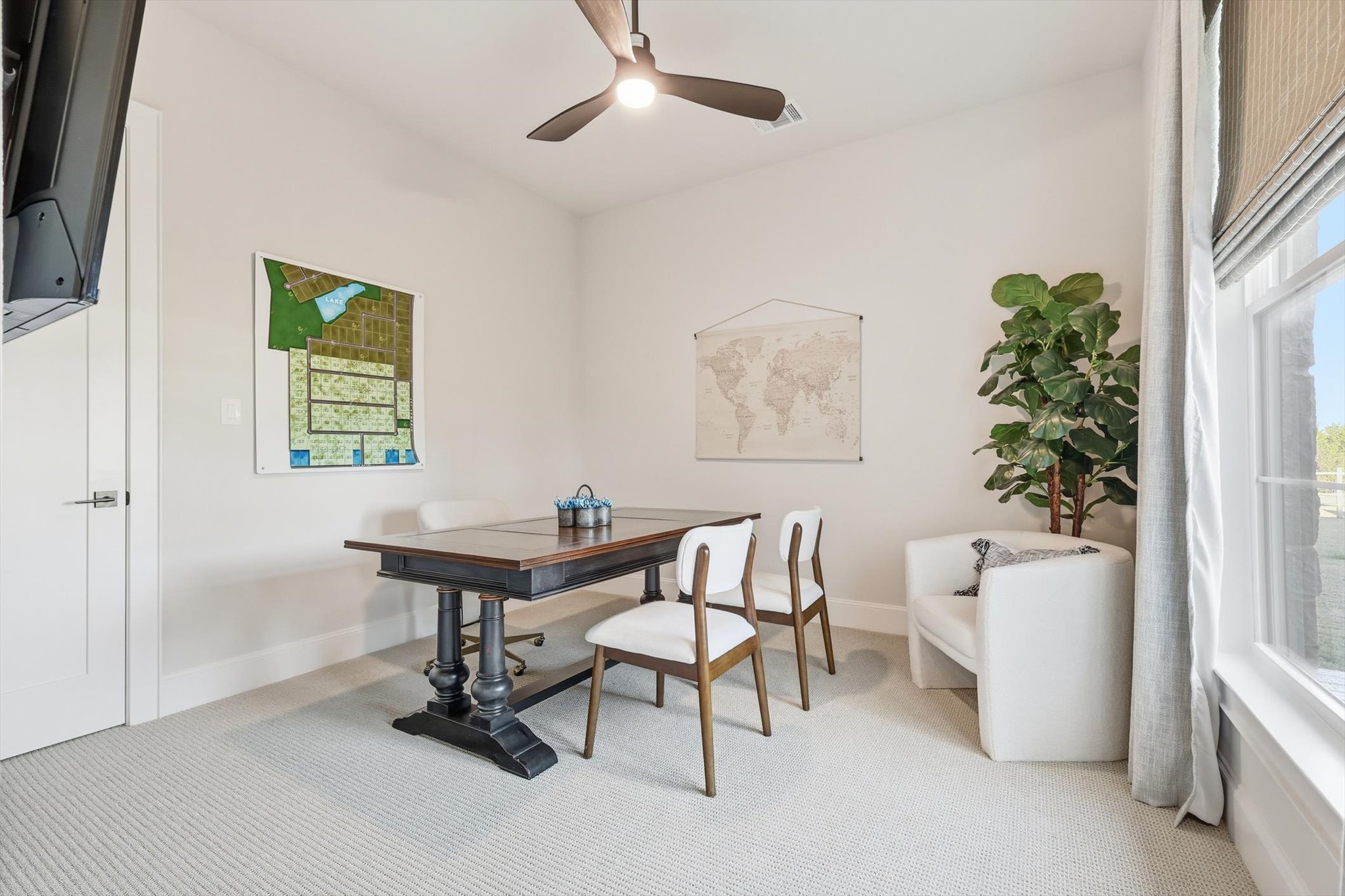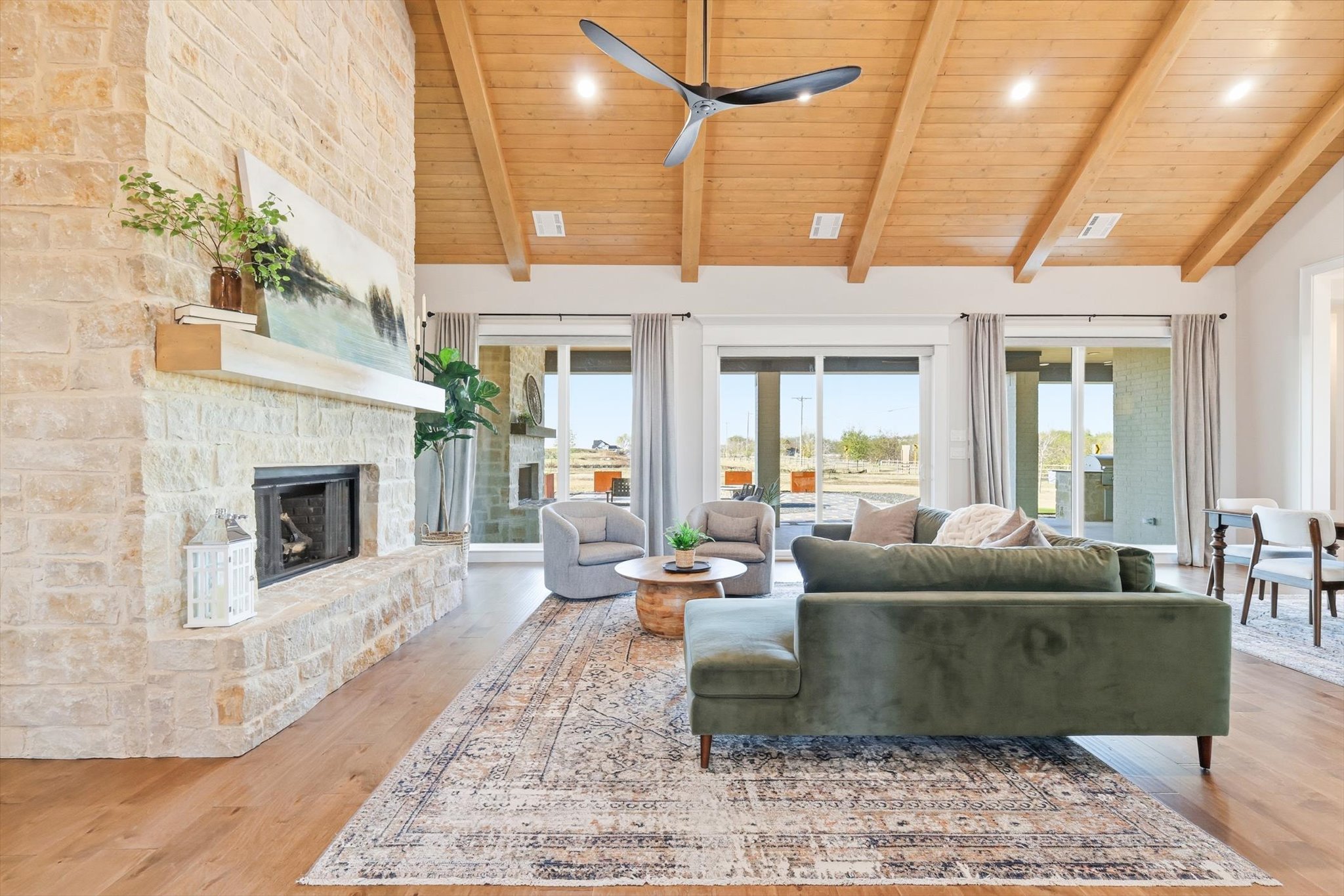 Located Outside City Limits, discover luxury in this 3,507 sq ft former model home on over an acre of beautifully landscaped grounds. This four-bedroom, three-bathroom residence includes a private study and features a seamless open-concept layout, perfect for entertaining. The chef’s kitchen showcases a 48” KitchenAid full gas range, striking stone backsplash, and a beautiful mix of painted white and white oak cabinetry, with a stunning white oak island as the centerpiece. The open flow from kitchen to dining and living areas creates a bright, inviting space ideal for gatherings. Large windows and sliding door give you natural light and gorgeous view of backyard. The private study features custom-made barn doors, and other custom barn doors are also carried throughout the home in the laundry room and the primary bathroom for a cohesive designer look. The primary suite is a true retreat with vaulted ceilings, lots of built in cabinets for storage, a spa-style bath featuring a freestanding soaking tub, oversized dual-head shower, double vanities, and an expansive walk-in closet with a custom island. Built for efficiency and durability, the home includes a full metal roof, spray foam insulation, and a fully encapsulated structure. Enjoy outdoor living in the covered outdoor kitchen featuring Coyote grill, refrigerator, sink, and stone countertops — perfect for year-round entertaining. There are four fireplaces, one in the living room, one on the front and back patio, and a fire pit! Coffee Bar and Walk in Pantry are off to the side of the kitchen, close to a door that leads you to the front patio and fireplace, perfect spot for morning coffee.